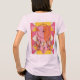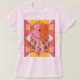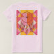 En digital drömkardesign centrerad på en geometrisk bakgrund. Drömcatchern har en cirkulär webben med ett vitt och orange nedfläckad-glas mönster, omgivet av ett tjockt rött gräns. Fyra stora dekorativa fjädrar ligger från grund i drömmaren, som var och en har ett gradientschema färg som går från rosa till orange till gult. Fjädrarna har ingående hylsor och dras i en stiliserad, strömmande stil. Bakgrunden består av ett kilt mönster som består av triangelblock i rosa, orange och vitt färg. Blocken är placerade i ett upprepande mönster och skapar en stjärnliknande effekt bakom drömmaren. Färg-programmet innehåller varma tonar av rosa, orange och gult, och drömmaren flyter mot det geometriska mönster. Bilden har en modern, konstnärlig tolkning av en traditionell design. Kvinnans t-shirt är en blek rosa, grundläggande kvinnors t-shirt.