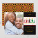 Skicka Kwanzaa önskemål till familj och vänner med det här anpassadets helgdag-kort. Ord Kwanzaa Blessings är en fasad av röd, grönt och guldfärgad gult. "Kwanzaa" i ord är designat för att likna en kinara, där varje brev representerar ett ljus med en guldlåga ovanför. Anpassa under det här orden med ditt eget meddelande och namn genom att använda den lättåtkomliga mallen. Överst finns en ställe för det år eller den text ni önskar. Byt bara ut exemplet mot ett eget familjefoto. Baksidan har ett fet mönster i svart, grönt, rött och gyllene gult. Kontrollera i butiken om du vill matcha returetiketter och party-leveranser!