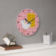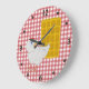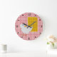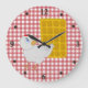 Roligtens köldklocka i ett rött och vitt gingham bord trasa tittar mönster, med svarta siffror och punkter, runt kant. Tecknad grafik av en stor våffel och en liten vit kyckling dekorerar klockans ansikte. Anpassa om du vill lägga till text. Gör en roligt till vilken sydlig mat som helst älskare.