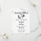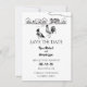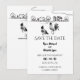 Det här bröllopet Spara datum-kortet har två kycklingar, en tupp och en höna, som är kära. De är satta mot en charmig linje teckning lantgård helt i svart och vitt.
