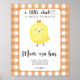 "En liten kyckling är på väg." Fira med den här tecknaden, kyckling, temat babydusch party! Söt chick med baby ansikte. Orangens bur.