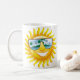 Upptäck din dag med sommaren i mugg med ett leende sol som bär coola glasögon. På andra sidan av mugg finns en text med texten "Kyl ut i sommar" Du kan ändra eller ta bort bildtexten genom att klicka på Anpassa den här mallen. Perfektens gåva till älskare under sommaren.