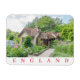 Ett foto av en vacker stuga i England som är tryckt på en kylmagnet i souvenir.