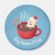 Magnet med en söt liten snögubbe som njuter av en dopp i kopp av hett kakaochoklad som om det vore en hett. Men tillsammans med candy cane smälter det bort. Texten lyder "Varm och Mysigt". En bra illustration för julens helgdagar.