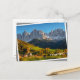 Fotovykort från den lilla byn Sankt Magdalena med den framstående kyrkan omgiven av träd på hösten färg framför högtoppar i Dolomitbergen i dagsljuset i Villnöss (Funes)-dalen i Sydtyrolen, Italien med vitt kant och texten "Trentino". Bilden roteras en bit för att skapa illusionen att den lossnar.