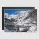 Magnetiskt fotokort från berömden St. Sebastian kyrkan i snö, uppbackat av stora Alpernor med en bro och en liten brok i Ramsau b. Berchtesgaden, nära Österrike på Tysklandare vinter.