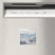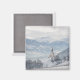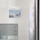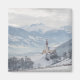 Fotomagnet från Souvenir med kyrkan St. Pankraz i ett alpregion i snö omgivet av moln och dimma på backe, med sikte över Zillertal valley med Alpernorna i bakgrunden i Fügen i Österrike på vintern.