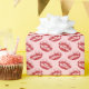 Röda läppstift kyssar mönster på ljus rosa bakgrund.