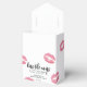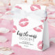 Söt singelbröllopspresentförpackning med rosa glittrig läppstiftmärken, det roliga talesättet 'kyss fröken adjö', deras namn och datumet för festen!