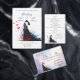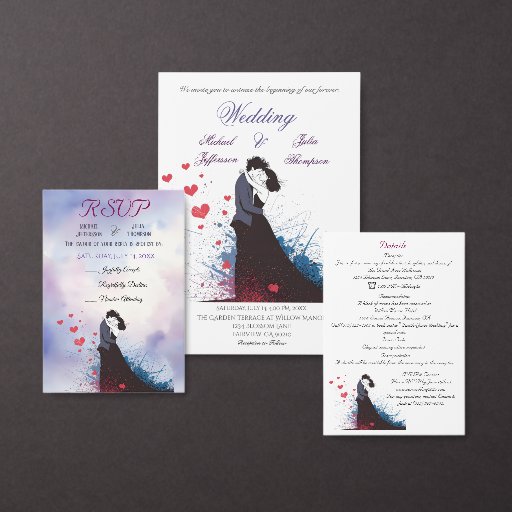 Denna elegant och konstnärliga design blandar romantik med en modern, uttrycksfull design. Det centrala är ett pars silhuett med passionerat sinne, symboliserar kärlek och enighet. Bilden har en stänk-effekt i kreativet i skuggor av djupblått, rött och svart, vilket ger en contemporary och en dynamisk tryckning. Spridda hjärtan förbättrar romantiken, medan snyggtens kalligrafteckensnitt ger en tidlös elegans. Layouten är ren men ändå uttrycksfull och skapar den perfekt för par som vill ha ett unikt, något okonventionellt och konstnärligt bröllop-tema. Bilden kombinerar traditionell sofistikering med en färsk, modern estetik, skapar den lämplig för kreativ, bohemi eller romantiskt bröllop.