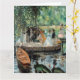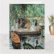 Pierre-Auguste Renoir. La Grenouillère . vacker landskapsbild vid floden i gröna toner. Det finns båtar på stranden. I mellangrunden står en grupp människor på en gångväg under ett vidsträckt träd. I bakgrunden finns hus och träd. Reproduktion av berömda konstverk bilder i public domain.