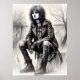 Un dessin au crayon d'une jeune femme au style punk rock, vêtue d'une veste en cuir et de jeans déchirés, assise dans un environnement urbain désolé avec des arbres dénudés en arrière-plan.