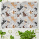 Cute Labradoodle/Goldendoodle hundar sitter och står och välter med kräm, aprikos, choklad, svart och parti jackar med utspridda ben av hund och tassavtryck mönster.