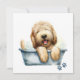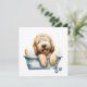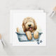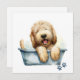 Färgillustration av en lycklig fluffy Labradoodle-hund i ett badkar i hund. Underbar för hundälskare.