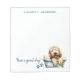 Färgillustration av en lycklig fluffy Labradoodle-hund i ett badkar i hund. Underbar för hundälskare. Redot att vara personlig med ditt namn överst och grund säger "Ha en underbar dag!" som kan ändras om du vill. Underbar för hundälskare, ägare till pudel, hund, husdjursarbetare, hund och veterinärer.
