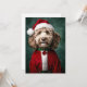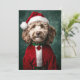 Den här bilden har en förtjusande Labradoodle som är klädd i en julklapp. Hund har en röd julhatt med en fluffy vit trim och en matchande röd sammet jackar med vita päls-accenter. Omkring nacke är en grönt med en röd, tass-formad märkre. Labradoodles förbannade päls och uttrycksfulla ögon ge är ett enastående, hjärtslitande utseende som perfekt fångar upp helgdag mot en mjuk bakgrund av grönten.