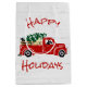 Labrador hämtar hundar i ett återkallat pickupt lastbil med grönt Julgran på rustiskt välluktat trä. Snowflake overlay