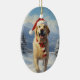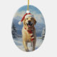 En färgstark utformning av en lycklig Labrador med en tomtehatt som rinner genom snöbergen och önskemål i god jul.