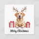 "This beautiful illustration features a detailed portrait of a loving Yellow Labrador Retriever with its characteristic broad head, gentle expression, and smooth golden coat. The dog is given a charming holiday touch with reindeer antlers adorned with small golden and green/blue ornaments. Two beautifully wrapped Christmas presents with red ribbons sit prominently on either side. This high-quality graphic is ideal for personalized holiday gifts for Lab owners, Christmas cards, apparel, ornaments, or any product celebrating this friendly and devoted dog breed."