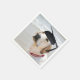 A Labrador retriever wearing a black graduation cap with a tassel and a red collar on a beach.