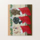 Labrador Retriever Puppies Julmålningspussel för Julhelg! Whimsical and Söt Labrador Retriever Painting, målad av Naomi Ochiai från Japan. Alla tre färg av Black Labrador Puppy och Chocolate Labrador Puppy och Gult Labrador Puppy är målade i bild. De leker i sina röda julklappar som hänger från den väldekorerade kaminen.