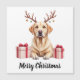 "Denna vackra illustration visar en detaljerad porträtt av en kärleksfull Yellow Labrador Retriever med dess karakteristiska breda huvud, milda uttryck och släta gyllene päls. Hunden har fått en charmig julstämpel med renhorn prydda med små gyllene och gröna/blå dekorationer. Två vackert inslagna julklappar med röda band sitter framträdande på vardera sidan. Denna högkvalitativa grafik är idealisk för personliga julgåvor till Lab-ägare, julkort, kläder, dekorationer eller andra produkter som firar denna vänliga och hängivna hundras."
