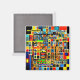 A vibrant geometric pattern, filled with colourful squares and rectangles, is overlaid with an intriguing sentence composed of words in various fonts and colours.