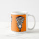 Kreativ lacrosse mugg med lax stick och boll på orangens bakgrund.