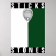 Rolig lacrossemålvakt "pinnar och stenar" motiverande affisch med lax-målvaktspinne på grön bakgrund. Lägg till din egen text för att anpassa.