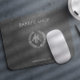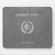 Barber-butiksmusslor med faux-silver-metallsaxar logotyp och barber-skript på mörk grått-läderbakgrund