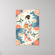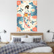This image is a vibrant and stylized illustration featuring a woman in traditional Japanese attire, specifically a kimono patterned with large floral and leaf motifs. The overall style is strongly reminiscent of Ukiyo-e woodblock prints, but with a modern, cleaner aesthetic, and a color palette that suggests Bingata dyeing from Okinawa.
