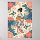 This image is a vibrant and stylized illustration featuring a woman in traditional Japanese attire, specifically a kimono patterned with large floral and leaf motifs. The overall style is strongly reminiscent of Ukiyo-e woodblock prints, but with a modern, cleaner aesthetic, and a color palette that suggests Bingata dyeing from Okinawa.