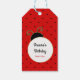 Vintage baby bär ladybug vingar och antenner på röd och svart bakgrund. Perfekt för en födelsedagsfest av en skidnappsdusch eller ett skänktema.