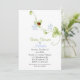 Vit babyduschinbjudan, med grafik av en blå blommar, överst, med en enda nyckelnos. Anpassa all text fält för din babyduschhändelse.