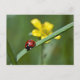 En ladybug (även känd ladybird eller ladybeetle) som tar en promenad längs ett blad av gräs med en gult lerblomma i bakgrunden. Makrofotografi som tagits i Förenade kungariket. Anpassa om du vill lägga till egen text och andra alternativ.
