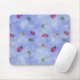 En söt vårtid mönster. Röda slöjor med svarta fläckar, grönt och gult löv flyter runt, söta rosa daisy, och lavendelfjärilar utgör denna ömtåliga och ömtåliga mönster på en blå lila bakgrund.