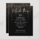 Olyckade bröllopsinbjudningar behöver inte vara tråkiga - djärva edgy champagnekaskaor med gnidig klädsel på sidan, i handskriven kalligrafi är "låt oss göra detta" - pars initialer överst - resten av texten är enkel och ren - allt på svart bakgrund. Stationär elegant bröllop.