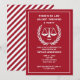 Kreativ juristexamen i party inbjudan med en skala av rättvisa i humor för studenten eller födelsedagsfest för advokater.