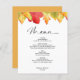 Fira din höstbröllop i stil utan att kompromissa med din budget med denna Budget Höstblad Bröllopsmeny. Med charmiga illustrationer av varmt tonad höstlövverk fångar denna meny design den mysiga, rustika skönheten av säsongen medan den erbjuder ett prisvärt sätt att förhöja era mottagningstabeller. Den lättlästa layouten listar elegant varje rätt och lägger till en genomtänkt detalj som guidar gästerna genom middagsupplevelsen. Det är den perfekta lösningen för par som vill skapa en sammanhängande, säsongsbetonad look utan att spendera för mycket.