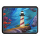Vackert, rött och vitt, randigt fyr på en klippande yta omgiven av blommor och blå vatten/himlar AI Art skapat med minx267