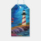 Vackert, rött och vitt, randigt fyr på en klippande yta omgiven av blommor och blå vatten/himlar AI Art skapat med minx267