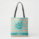 Över skuren mot väskan med blå bakgrund, orange, persikor och vitt chevron rand och en stor blå havssköldpadda med ett område som du lätt kan lägga till namn före beställning.