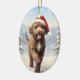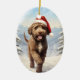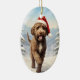 En färgstark design av en Lagotto Romagnolo som bär en julhatt som går genom snöbergen och önskar God jul.