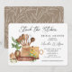 Snyggt lagrar köket inbjudningskort för möhippan med vattenfärgskök i verktyg, en grönt, styckbord, orange blommor och personlig rullstift.