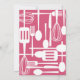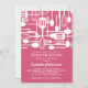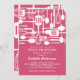 Retro stil-redskap för matlagning och matlagning finns på denna vackra inbjudan till en Möhippa för "lagrar i köket" för den blivande bruden. Det är enkelt att anpassa schemat i färg med gafflar, skedar, knivar, spatulor och whisky i skarp vit på en solid bakgrund som du kan ändra (och som visas på rosan här).