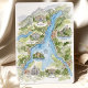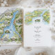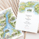 Celebrate a romantic Lake Como celebration with this two-sided watercolor destination wedding invitation. The artwork features a hand-painted illustrated map of Lago di Como, complete with shimmering blue water, terraced hillsides, and storybook villages labeled Bellagio, Tremezzo, Varenna, Lenno, Como City, and Cernobbio. Iconic villas, a lakeside cathedral, winding roads, and tiny ferries are rendered with delicate ink line work and soft washes of green, gold, and sky blue, giving the design the charm of a vintage travel sketch.