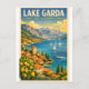 Travel poster featuring Lake Garda, Italy, in a classic retro travel-poster style. Central focus on the expansive alpine lake with colorful Italian lakeside villages, lemon groves and cypress trees along the shore, sailboats gliding across the sparkling blue water, and rugged mountains rising dramatically in the background under bright Mediterranean sunlight. The scene captures the lively yet relaxed atmosphere of Italy’s largest lake. Vibrant color palette of azure blue water, sunlit stone villages, lush green hills, and warm golden sky tones. Clean graphic illustration with subtle vintage grain texture. Bold vintage typography headline: “LAKE GARDA – SUNLIT JEWEL OF NORTHERN ITALY”. Vertical 2:3 layout, high-resolution, print-ready.