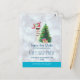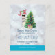 Spara datumet julfest kort. En rolig illustration. En söt lama som bär svarta solglasögon och en röd tomtehatt. Står bakom ett julgran med festliga presenter. Ordet Glädje skrivet ovanför hans huvud i ett färgglatt julfontän. Silver bokeh bakgrund med en isblå kant. Whimsisk och rolig jul tema design.