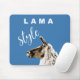 Lama porträtt om blå bakgrund och vit text "Lama Stil"