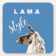 Lama porträtt om blå bakgrund och vit text "Lama Stil"